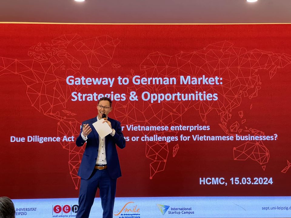 At the heart of the seminar were illuminating discussions centered around the German market, delivered by esteemed industry experts. Mr. Gunnar Kassberg, Vice Deputy of SEPT Competence Center, captivated the audience with a keynote address that provided comprehensive market insights into Germany. He elucidated on the current landscape and highlighted the potential avenues for Vietnamese enterprises to successfully navigate and establish themselves within this lucrative market. Moreover, Mr. Kassberg delved into the implications of the Due Diligence Act, shedding light on its significance for Vietnamese businesses eyeing expansion into Germany.